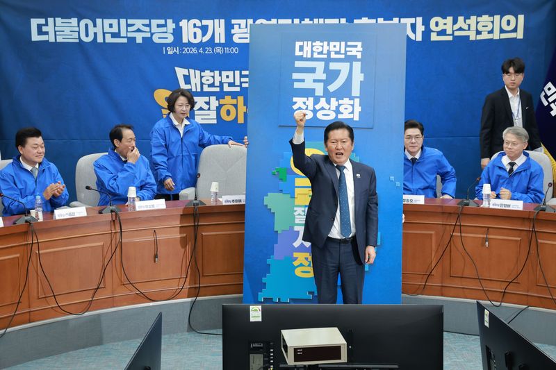 정청래 당 대표는 이날 연석회의에서 "우리 16명의 후보들이 자라온 환경과 역사, 생각은 조금씩 다를 수 있겠지만, 이 문장 하나는 다 같은 생각일 것"이라며 "우리는 6·3 지방선거 승리와 이재명 정부의 성공에 역사적 사명을 띠고 이 땅에 태어났다"고 말했다.
