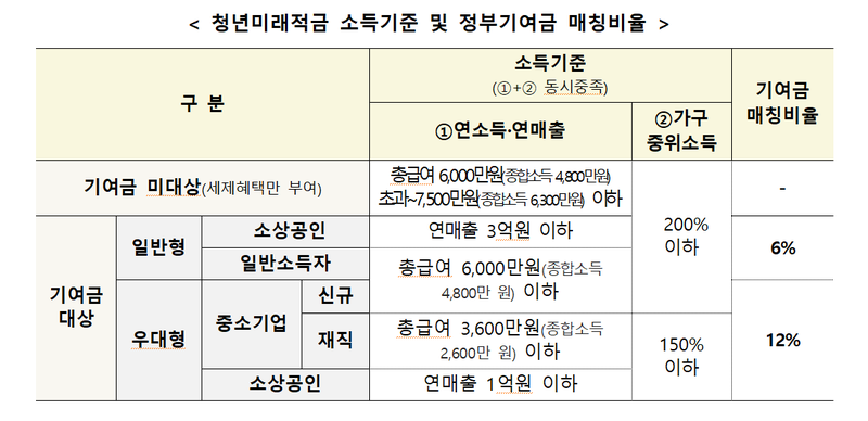 일반형은 총급여 6000만원 이하거나 연매출 3억원 이하 소상공인 중 중위소득 200% 이하를 대상으로 한다. 매월 납입금의 6%를 정부기여금으로 지급한다. 우대형은 총급여 3600만원 이하의 중소기업 재직자 또는 연매출 1억원 이하 소상공인 중 가구 중위소득 150% 이하가 대상이다. 일반형 소득기준을 충족하면서 지난해 처음 취업해 중소기업에 재직 중인 청년도 포함된다. 매월 납입금의 12%가 정부기여금으로 지급된다.