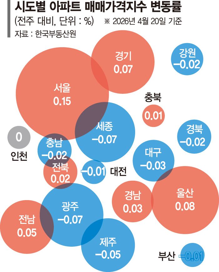 특히 강남3구에서 시작된 하락세가 점차 진정되는 분위기다. 송파구는 0.07% 상승하며 2월 4주 이후 9주간 이어진 하락 흐름(-0.01%)을 끊고 반등했다. 서초구는 -0.06%에서 -0.03%로, 용산구는 -0.04%에서 -0.03%로 각각 낙폭을 줄였다. 강남구는 -0.06%로 전주와 동일한 수준을 유지했다.