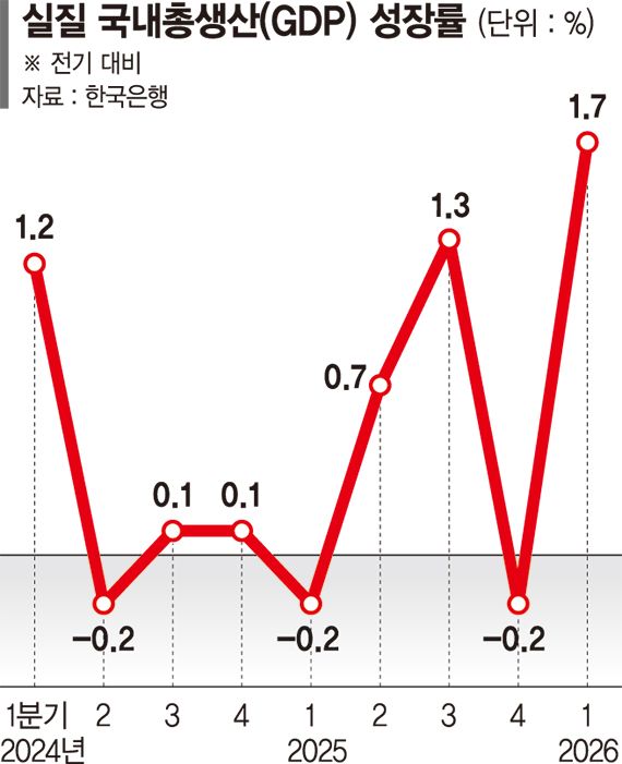 다만 이번 속보치는 2월 말에 발발한 중동 사태에 따른 공급망 훼손, 국제유가 상승, 환율 변동성 심화 등의 여파가 온전히 반영되진 않았다. 이에 따라 2·4분기 이후 성장에 하방 압력이 가해질 여지가 있다는 분석이다.