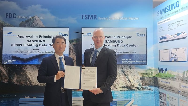 삼성중공업은 지난 20~23일(현지시간) 나흘 간 미국 워싱턴 D.C.에서 열린 '데이터센터월드(DCW 2026)'에서 자체 개발한 '부유식데이터센터' 관련 미국 선급(ABS)과 영국 선급(LR) 으로부터 50메가와트(MW)급 개념설계 인증(AiP)을 획득했다고 24일 밝혔다.