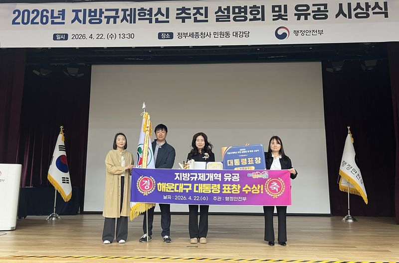 24일 부산 해운대구에 따르면 지난 22일 오후 정부세종청사 민원동에서 열린 '2026 지방규제혁신 추진 설명회 및 유공 시상식'에서 구가 대통령 표창의 영예를 안았다.