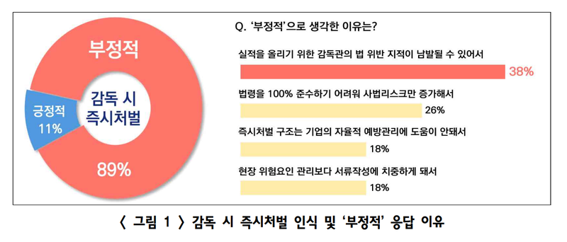 경총은 이러한 결과가 정부가 산업안전감독관 대규모 확충과 함께 즉시처벌 중심의 감독정책으로 전환을 추진하면서 기업들의 부담이 반영된 것으로 풀이했다. 특히 즉시처벌이 이루어질 경우 경미한 위반까지 처벌 대상이 되면서 위험요인 개선보다 서류작성 등 행정업무에 초점이 맞춰질 수 있다는 우려가 크다는 분석이다.