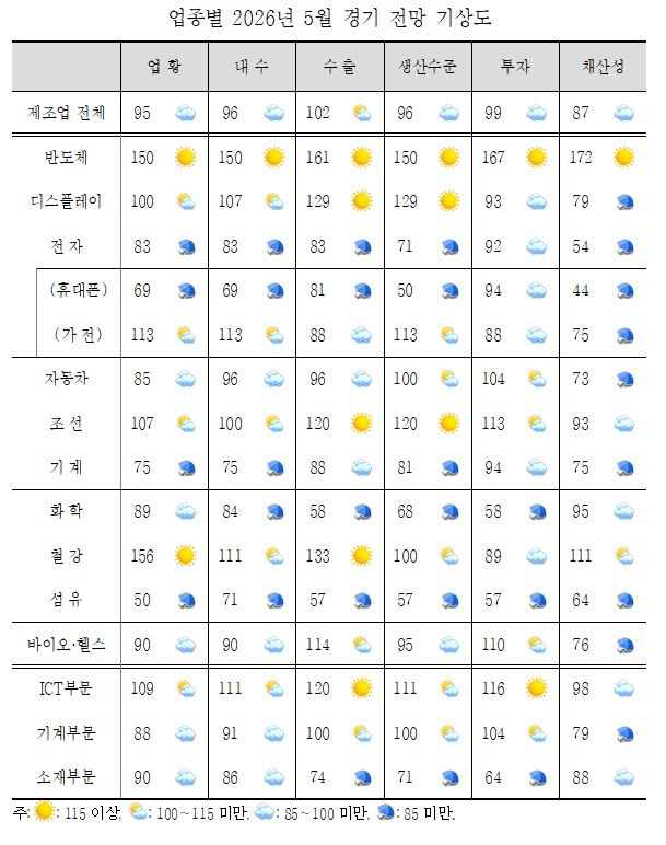 세부 업종별로는 반도체(150), 가전(113), 조선(107), 철강(156) 등이 기준치 100을 상회해 전망이 밝았다.