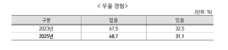 26일 성평등가족부가 발표한 '2025 학교 밖 청소년 실태조사'에 따르면 최근 2주간 일상생활을 중단할 정도로 우울감을 경험한 비율은 31.1%로 나타났다, 이는 직전(2023년) 조사 당시 32.5% 보다는 소폭 줄어든 수치지만 여전히 30% 대를 유지 중이다.