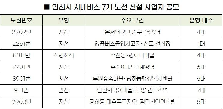 【파이낸셜뉴스 인천=한갑수 기자】 인천시는 영종, 계양, 검단, 강화 등 신규 입주 수요가 급증하는 지역의 교통 불편을 해소하고 행정체제 개편에 따른 교통 여건 변화에 대응하기 위해 시내버스 노선 7개를 신설한다.