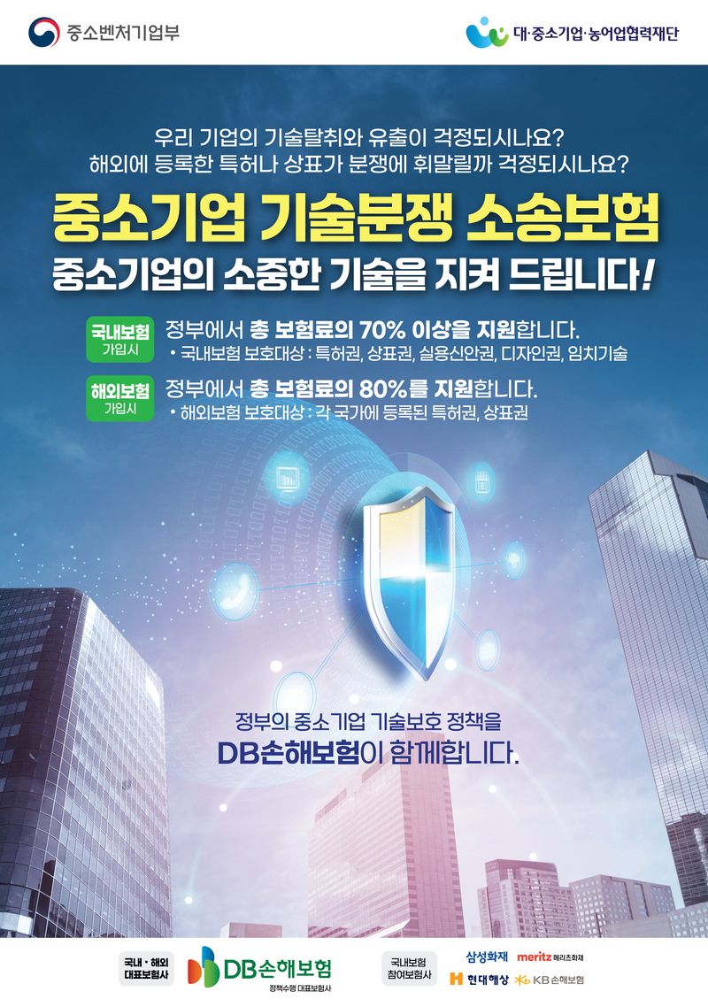 27일 보험업계에 따르면 DB손해보험이 중소벤처기업부 주관, 대중소기업농어업협력재단 운영 보험제도인 '중소기업 기술분쟁 소송보험' 대표보험사로 결정됐다.