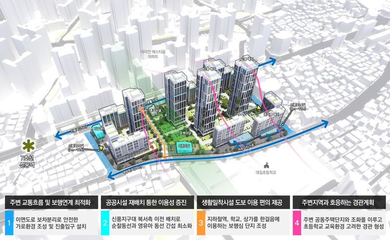 또한 어린이집과 인접한 대상지 남측 신풍지구대를 신풍역 인근인 북서측으로 이전 배치한다. 이와 함께 단지 어디서든 지하철역·초등학교·상가 등 생활밀착시설을 한걸음에 이용하는 보행 중심단지를 조성한다.