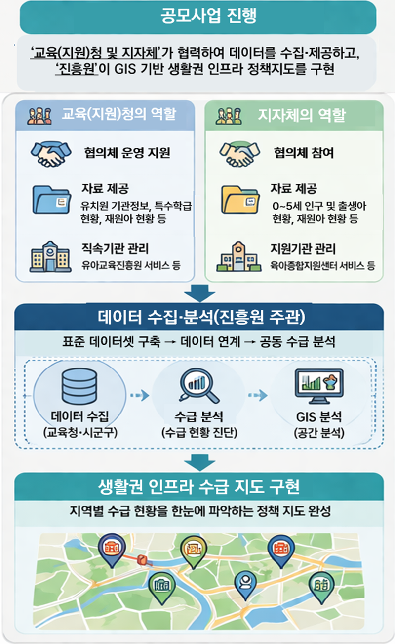 이번 사업은 교육청과 지자체가 협업해 각자 보유한 데이터를 연계하는 방식으로 설계됐다. 교육청은 유치원 기본 현황과 재원아 정보를, 지자체는 연령별 영유아 인구와 출생아 현황, 어린이집 재원아 정보를 각각 제공한다. 한국보육진흥원이 이를 취합해 GIS 분석을 거친 인프라 정책지도를 구현한다는 구상이다.