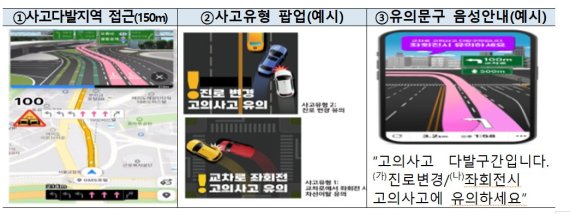 안내 방식도 고도화된다. 기존에는 사고 다발 지역 진입 직전 15m 시점에 음성 안내가 나왔지만, 앞으로는 150m 전부터 선제적으로 안내가 시작된다. 진로 변경·좌회전 등 빈발하는 사고 유형을 세분화해 팝업으로 시각화해 안내해주는 기능도 추가됐다. 가령 운전자가 해당 구간에 접근하면 "고의사고 다발 구간입니다. 진로 변경 또는 좌회전 시 고의사고에 유의하세요"라는 식의 안내가 나온다.