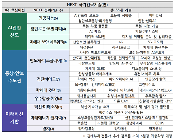 이와 함께 AI전환 및 에너지 기반 확충을 위해 AI인프라 고도화, 블록체인, 핵융합, 지능형 전력망, 재생에너지, 탄소포집·활용·저장(CCUS) 등이 신설된다. 기술패권 경쟁의 화두가 되는 '국방·안보 중요기술' 확보를 위해 국방반도체, 바이오인공장기·혈액, 뇌·컴퓨터 인터페이스(BCI), 재사용발사체, 드론, 친환경·자율운항 선박 기술 등이 보강됐다.