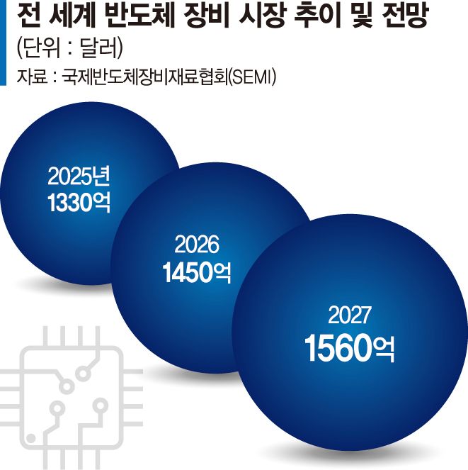 이같이 올 들어 반도체 장비기업들의 수주물량이 늘어나는 이유로 최근 AI 가속기, 고대역폭메모리(HBM) 등 반도체 수요가 폭발적으로 증가하고 이에 따라 삼성전자와 SK하이닉스 등 반도체 제조사들이 공장 증설과 함께 장비 도입에 적극 나섰기 때문으로 풀이된다. 실제로 국제반도체장비재료협회(SEMI)에 따르면 전 세계 반도체 장비 시장 규모는 지난해 1330억달러(약 197조원)로 전년과 비교해 13.7% 증가했다. 특히 관련 시장은 올해 1450억달러, 내년 1560억달러로 꾸준히 증가할 것으로 전망된다.