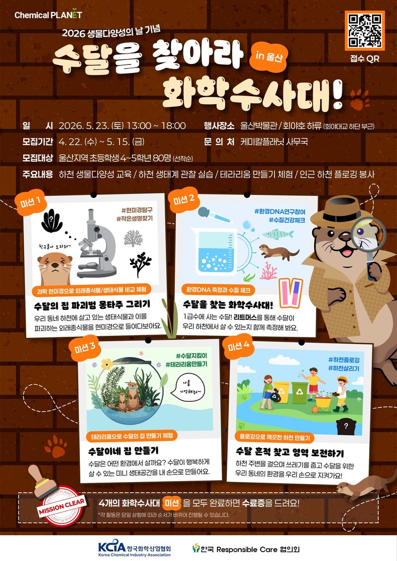 [파이낸셜뉴스] 한국화학산업협회는 한국RC협의회와 함께 다음달 23일 울산 지역 초등학교 4~5학년 학생들을 대상으로 ‘2026 열려라! 즐거운 화학세상(Chemical PLANET - 수달을 찾아라 화학수사대!)’을 개최한다고 28일 밝혔다.