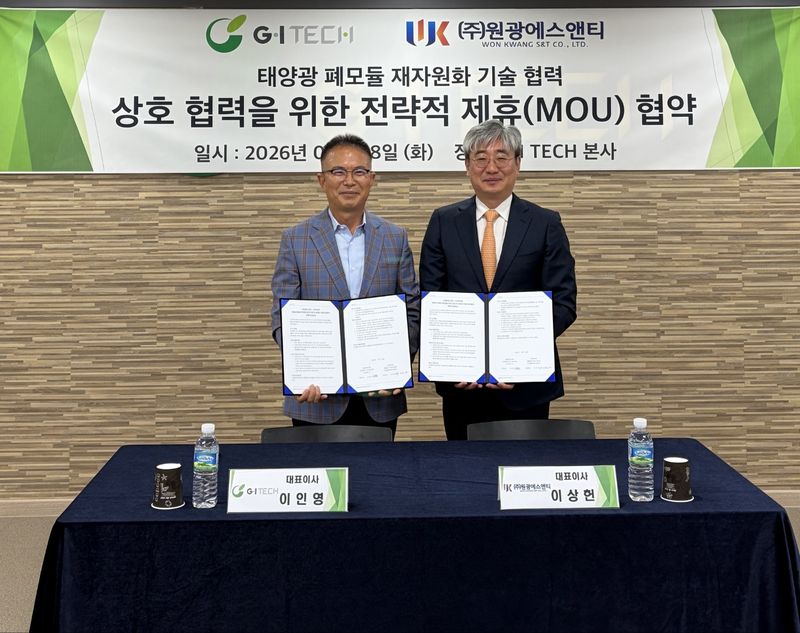 지아이텍은 원광에스앤티와 '태양광 폐패널 재자원화 장비 고도화 및 글로벌 사업화'를 위한 업무협약을 체결했다고 28일 밝혔다. 이번 협약을 통해 지아이텍은 피지컬 AI를 기반으로 태양광 재활용 장비 고도화를 주도하는 한편, 글로벌 유지보수 사업 진출을 위한 교두보를 마련했다.