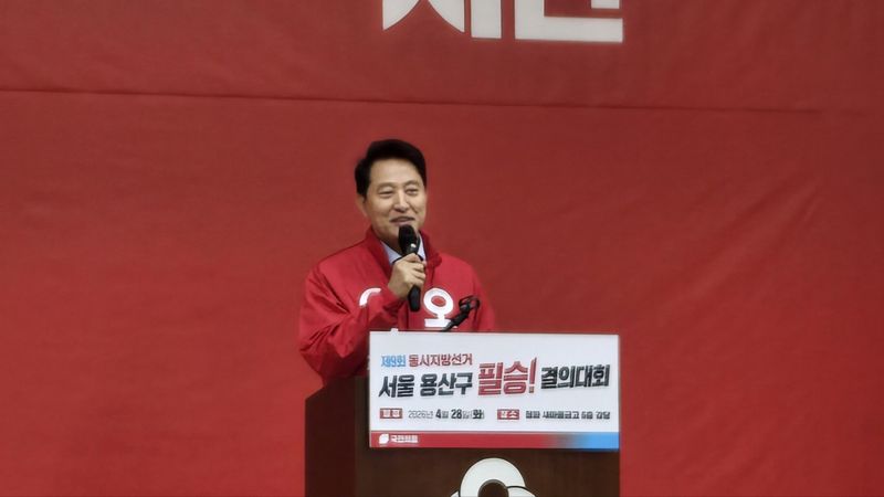 오 후보는 28일 서울 용산구 청파새마을금고 본점에서 열린 용산구 필승결의대회 직후 기자들과 만나 유세 현장에서 빨간 점퍼를 입은 배경을 묻는 질문에 "국민의힘의 색깔은 원래 빨간색"이라며 "제가 국민의힘의 적자다. 제가 빨간색을 입지 않으면 누가 입겠느냐"고 밝혔다.