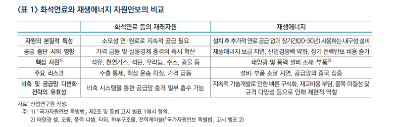 재생에너지는 설비 설치 이후 수십 년간 운영되는 내구재라는 점에서 화석연료처럼 비축이나 도입선 다변화로 대응하기 어렵다. 기술 변화 속도가 빠른 만큼 재고 자산의 구식화 위험이 크고, 품목별 이질성과 규격 다양성으로 대체 가능성도 제한적이다. 여기에 특정 국가에 집중된 글로벌 공급망 구조까지 고려하면, 안정적 조달을 위해서는 국내 산업 기반을 확보하는 것이 사실상 유일한 대응 수단에 가깝다는 지적이다.