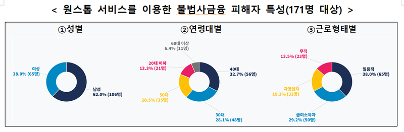 지난 2월 말부터 시행 이후 지난 8주간 233명이 피해 상담을 진행했으며, 이 가운데 불법사금융 계약의 내용이 정확하게 파악된 53명(채무건수 371건)에 대해 분석한 결과 1인당 불법사금융 이용금액(대출원금)은 약 1097만원, 1인당 피해액(실제 상환한 금액)은 약 1620만원으로 집계됐다. 평균 연 이자율이 1417%로, 대부계약 무효 기준(연 60%)을 크게 초과했다.