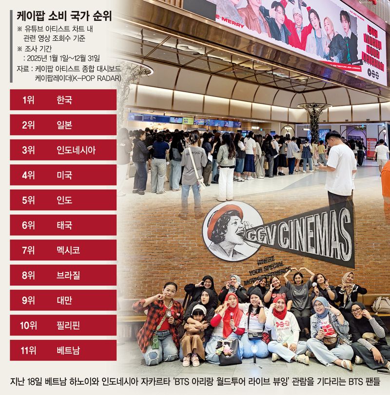 BTS를 비롯한 K팝의 인기는 동남아와 인도 전역에서 빠르게 확산되고 있다. 'BTS노믹스'라는 용어가 등장할 정도다. 음악 스타트업 스페이스오디티의 케이팝레이더(K-POP RADAR)가 발표한 '2025 케이팝 세계지도'에 따르면 인도네시아(3위), 인도(5위), 태국(6위), 필리핀(10위), 베트남(11위) 등 동남아와 인도 국가들이 상위권을 차지했다.