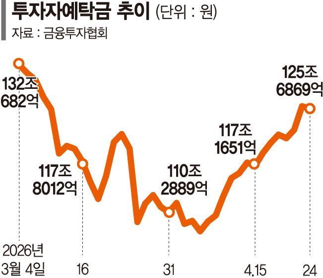 이후 코스피가 빠르게 반등하면서 대기자금도 다시 늘었다. 지난 13일 116조1075억원, 15일 117조1651억원, 17일 120조5854억원을 기록한 뒤 22일에는 122조5381억원으로 올라섰다. 이어 23일 126조351억원까지 뛰며 다시 126조원을 돌파했고, 24일에도 125조6869억원으로 높은 수준을 유지했다. 저점이었던 지난 6일과 비교하면 불과 18일 만에 18조2195억원이 증가했다.