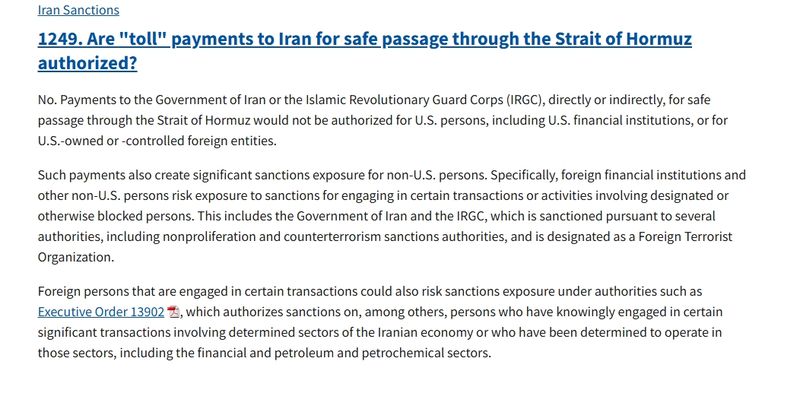 OFAC은 "호르무즈 해협의 안전한 통항을 대가로 이란 정부나 이란혁명수비대(IRGC)에 직접적 또는 간접적으로 대금을 지급하는 것은 미국 금융기관을 포함한 미국인, 또는 미국인이 소유하거나 통제하는 외국 법인에 허용되지 않는다"고 밝혔다.