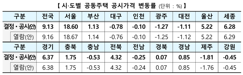[파이낸셜뉴스] 전국 평균 공동주택 공시가격이 전년 대비 9.13% 상승한 것으로 나타났다. 서울은 18.60% 올라 전국에서 가장 높은 상승률을 기록했다.