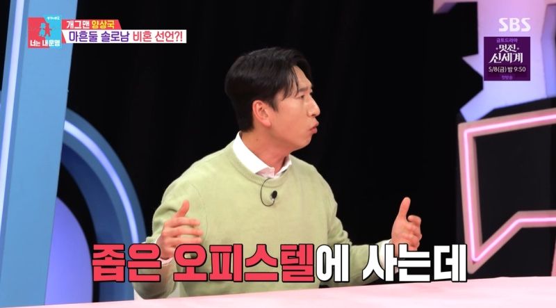 양상국은 "나는 생긴 거에 비해서 깔끔하게 산다. 사실 이사 전에는 오피스텔에 혼자 살다 보니 짐이 많았다. 그러니까 일이 안 풀리더라"고 털어놨다.