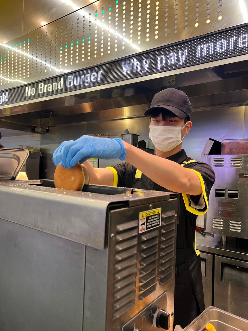 감자튀김 포장에 손이 익어갈 무렵, 번과 패티를 굽는 그릴 앞쪽으로 자리를 옮겼다. 기계에 넣고 굽기만 하면 끝날 줄 알았다. 하지만 쉴 새 없이 몰아치는 주문 속도에 맞춰 구워내는 타이밍이 핵심이었다. 너무 일찍 구우면 재료가 식어버리고, 늦게 구우면 버거 조리 전체가 밀리기 십상이었다. 가열기의 뜨거운 열기 탓에 화상 위험도 도사리고 있었다.