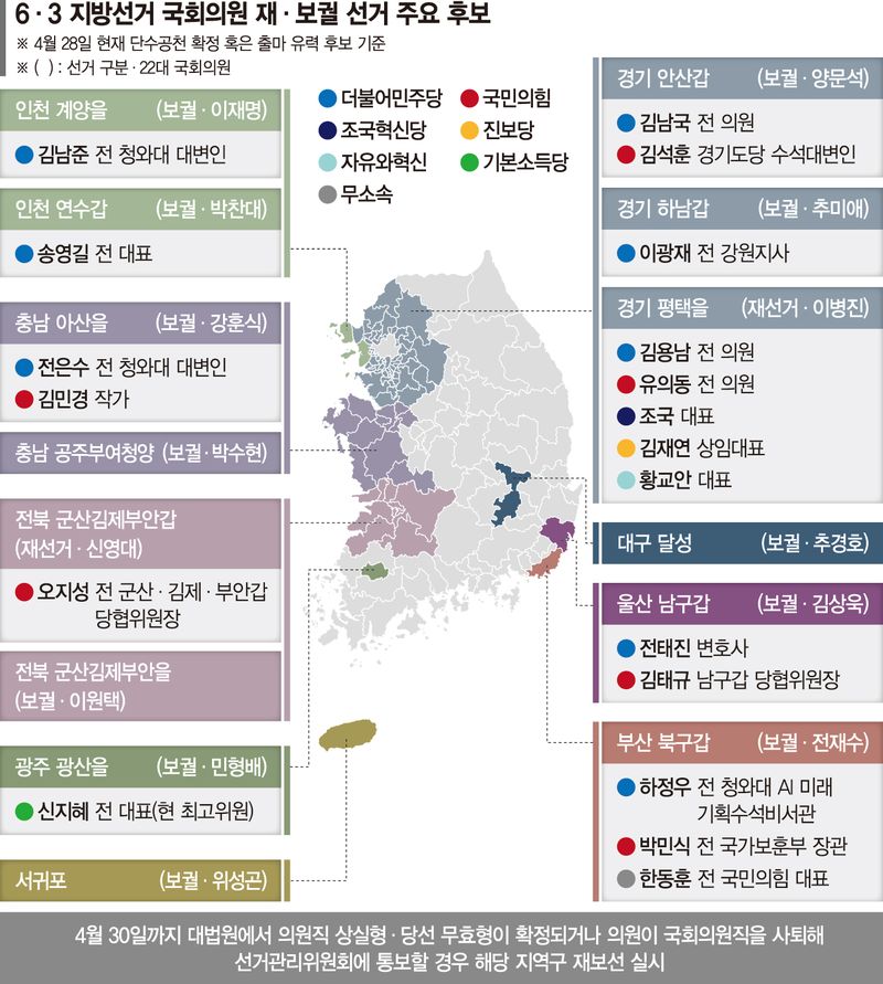 이날 광역단체장 선거 출마로 금배지를 내려놓은 의원은 민주당의 추미애(경기 하남갑)·박찬대(인천 연수갑)·전재수(부산 북구갑)·김상욱(울산 남구갑)·박수현(충남 공주·부여·청양)·민형배(광주 광산을)·이원택(전북 군산·김제·부안을)·위성곤(서귀포), 국민의힘의 추경호(대구 달성군) 등 9명이다. 기존 경기 안산갑·평택을, 인천 계양을, 충남 아산을, 전북 군산·김제·부안갑 등까지 더해 총 14곳에서 국회의원 보선이 치러진다.