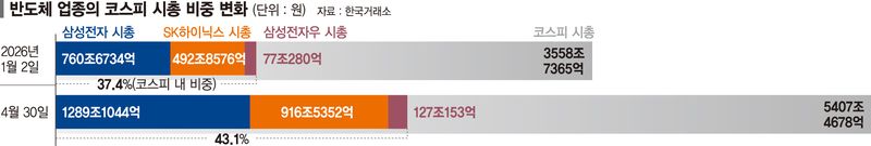 시가총액 상위 종목 구성에서도 반도체 쏠림이 뚜렷해졌다. 연초에는 삼성전자와 SK하이닉스가 1·2위를 차지한 가운데 삼성전자우가 5위에 머물며 상위 3개 종목 중 반도체 비중은 2개에 그쳤다. 그러나 4월 말에는 삼성전자우가 3위로 올라서면서 상위 3개 종목이 모두 반도체로 채워졌다. 여기에 SK하이닉스 지분 약 20%를 보유한 최대주주인 SK스퀘어도 8위에서 4위로 올라서며 상위권 전반이 반도체 영향권에 들어간 모습이다.