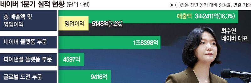 네이버는 올해 1·4분기 연결 기준 매출액 3조 2411억원, 영업이익 5418억원을 기록했다고 30일 밝혔다. 전년 동기 대비 매출은 16.3%, 영업이익은 7.2% 각각 증가했다.
