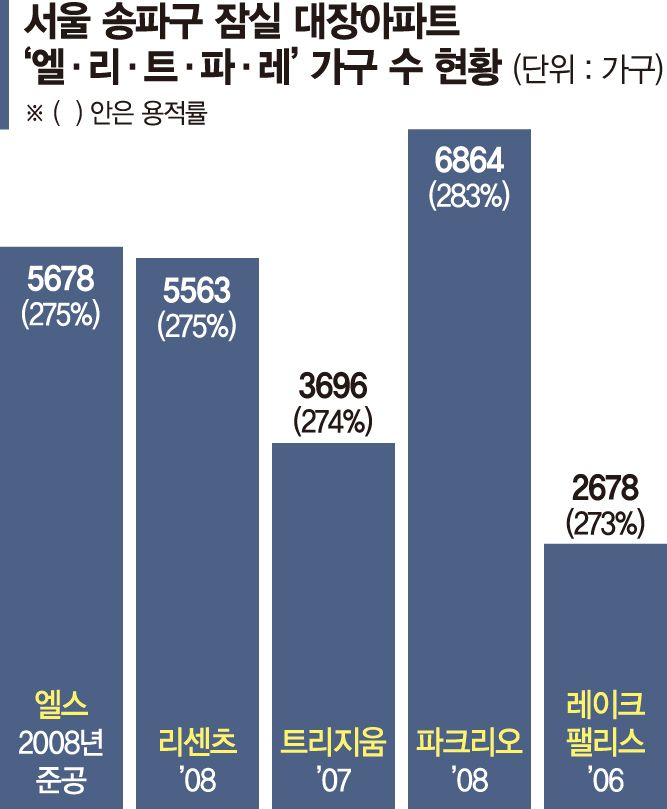 30일 업계에 따르면 5678가구 규모의 잠실 엘스에서는 올해 초부터 입주민들을 대상으로 리모델링 관련 설문조사를 진행중이다. 리모델링 연한인 15년을 넘겼고, 재재건축을 하기에는 용적률이 높아 사업성이 나오지 않을 것이라는 판단에서다. 실제로 잠실의 엘스·리센츠·트리지움·파크리오·레이크팰리스 모두 용적률이 273~283%로 높다.