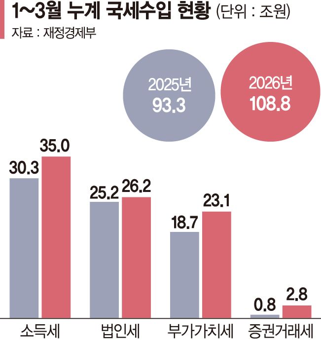 3월 한 달간 걷힌 세수만 37조8000억원으로 1년 전보다 5조5000억원 늘었다. 국세수입 증가는 소득세와 부가가치세, 증권거래세가 견인했다. 올 3월 누계 기준으로는 소득세가 4조7000억원, 부가가치세가 4조5000억원 증가했다.