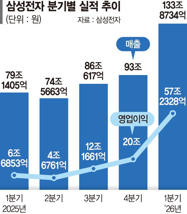 삼성전자는 올해 1·4분기 매출과 영업이익이 각각 133조8700억원, 57조2300억원으로 집계됐다고 30일 밝혔다. 매출과 영업이익은 각각 전년 동기 대비 69.16%, 756.1% 증가했다. 지난해 4·4분기를 단숨에 뛰어넘은 분기 역대 최대 실적이다.